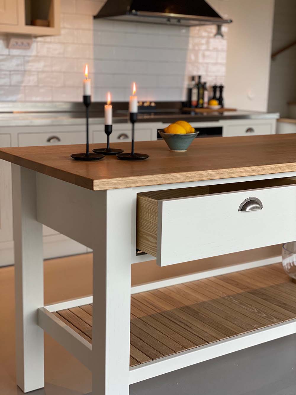 Köksö i massiv ask. Bänkskiva och hyllplan i ek.