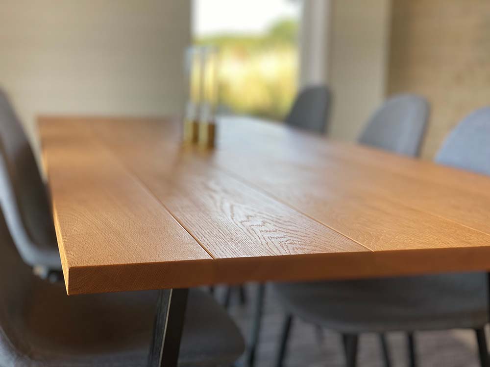 Matbord med massiva oljade ekplankor och svartbetsat lackat underrede i massiv ek.